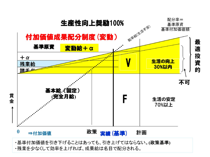 戦略(目標)と自己実現を結ぶ「インセンティブ制度」の確立 経営戦略実現し、自己実現を果たした成果をどのように賃金制度に結びつけるか、インセンティブとモチベーションの有機的に連動したシステム設計が重要です。 WHY 会社と社員は 運命共同体 ! 社業の安定向上を計る。社員の幸福を計る。 2040年の「8掛け社会の到来など未曽有の経営環境の変化が訪れつつあります。 今後は、経営計画と人材方針をきちんと連動させ、必要とする人材をどのように育成するかが、課題となります。 それには、まず企業のトップが、目指す自社の方向性を明確にして共通の目的として経営計画を示し、その実現のためどういう能力を求めているのか、を全従業員に示し、経営計画を実現するための人事方針を描き、実践することが求められます。 経営計画と人事方針が連動すると、必然的に所属組織への愛着、モチベーションも高まり、従業員業務パフオーマンス向上、企業業績の根幹である付加価値生産性が高まり、結果として経営戦略実現につながることになります。 |